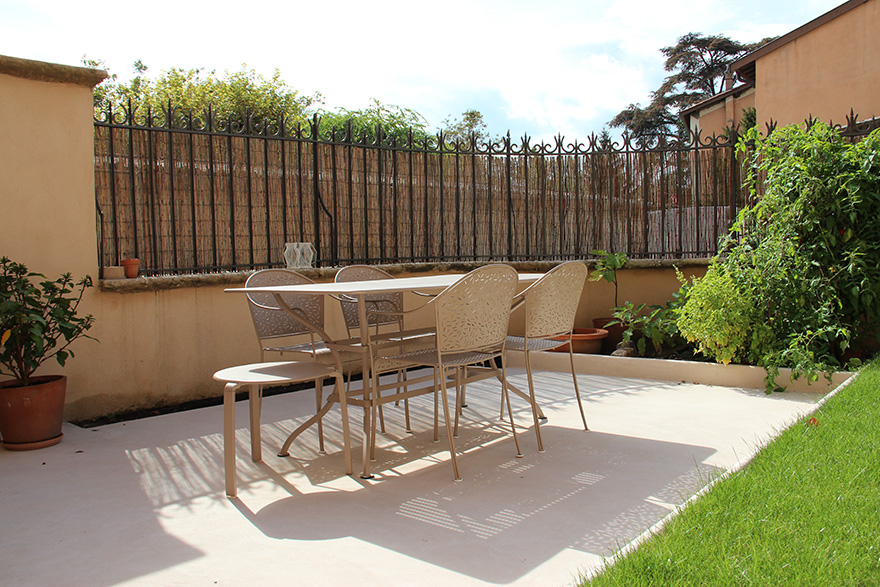 Terrasse clair, gazon et porte rouge Maison de ville Lyon Sol de terrasse en béton ciré spatulable 25 m2